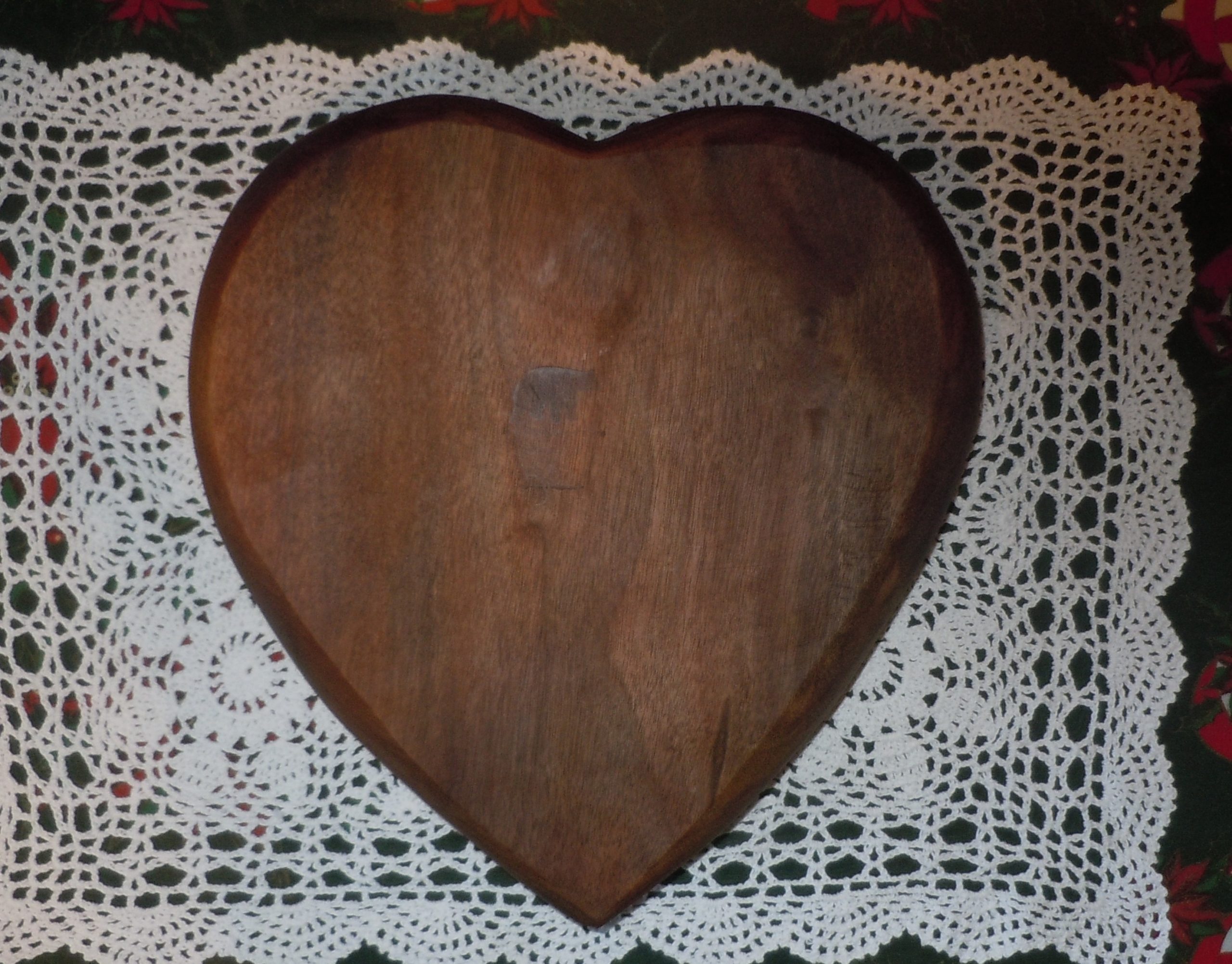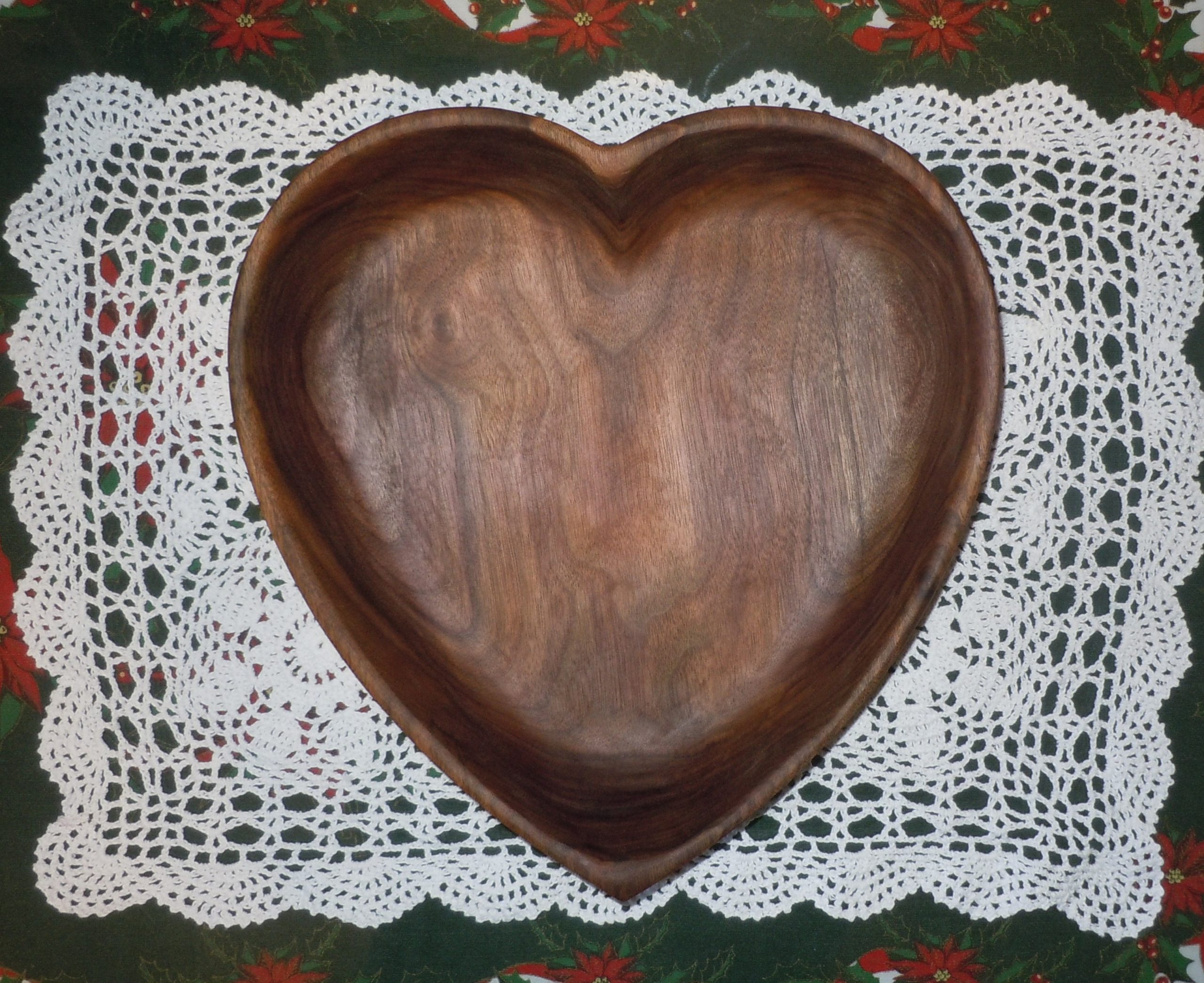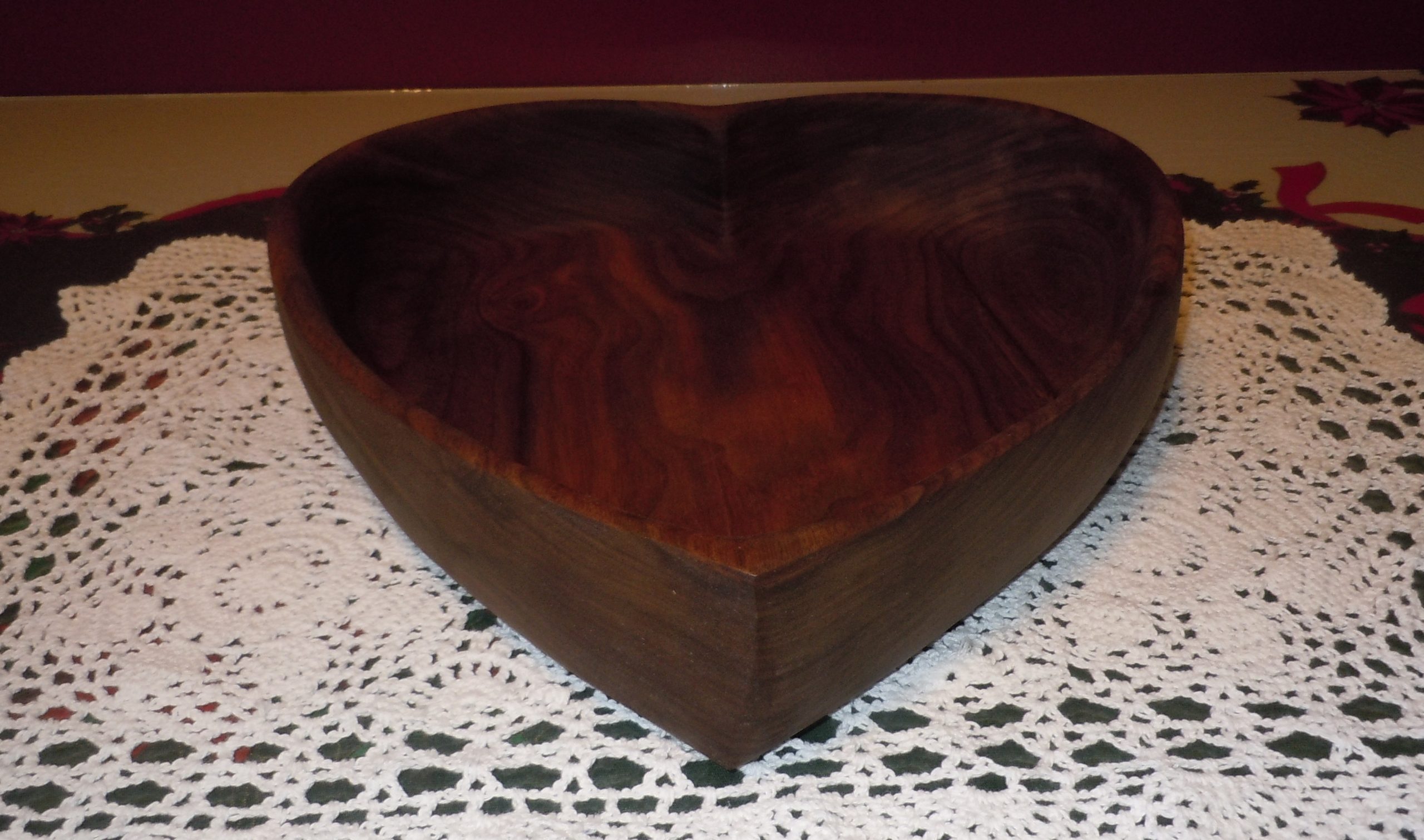 This is a georgous black walnut heart bowl that’s sanded inside and out. Measures approx 14″ x 3″ H
