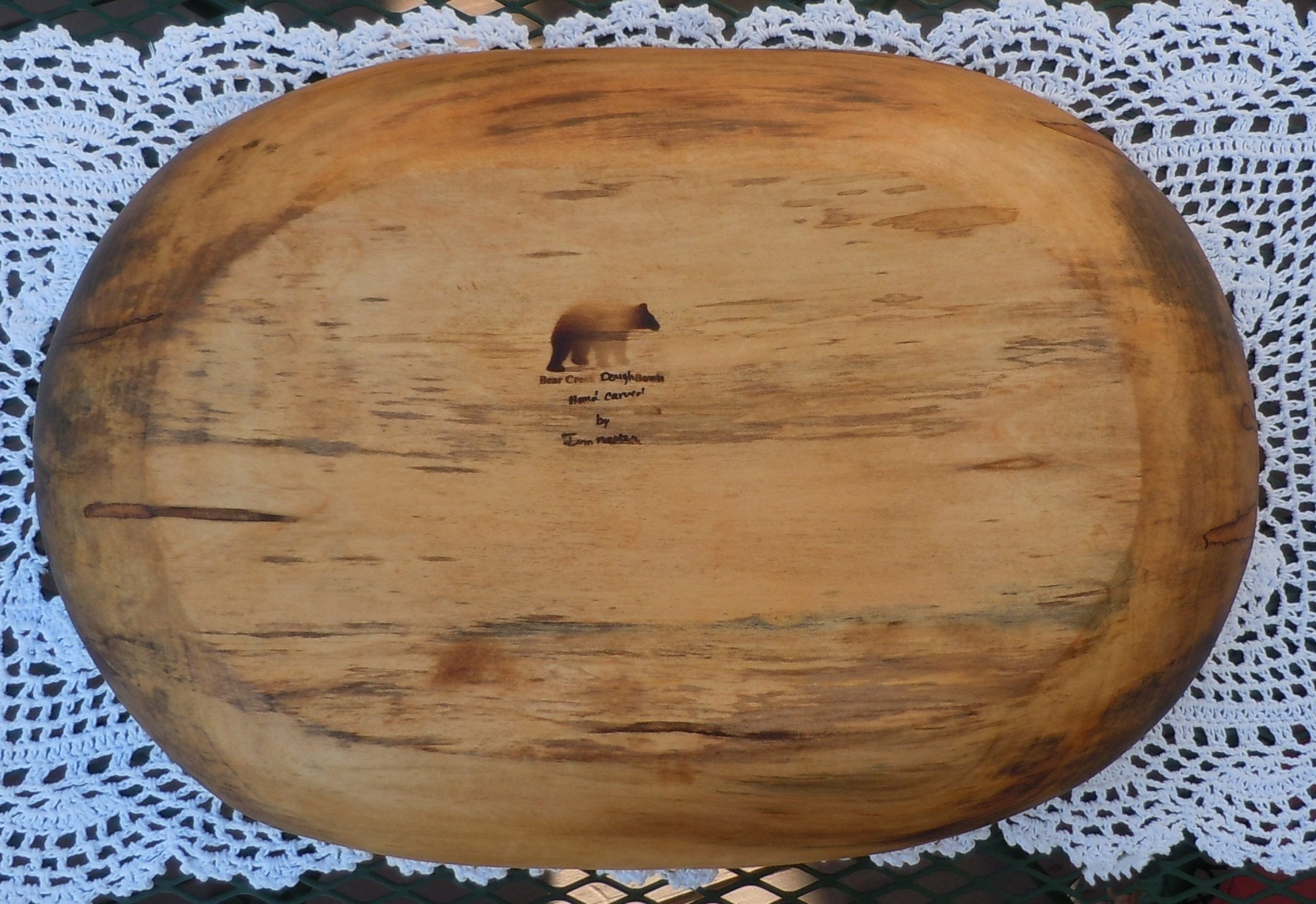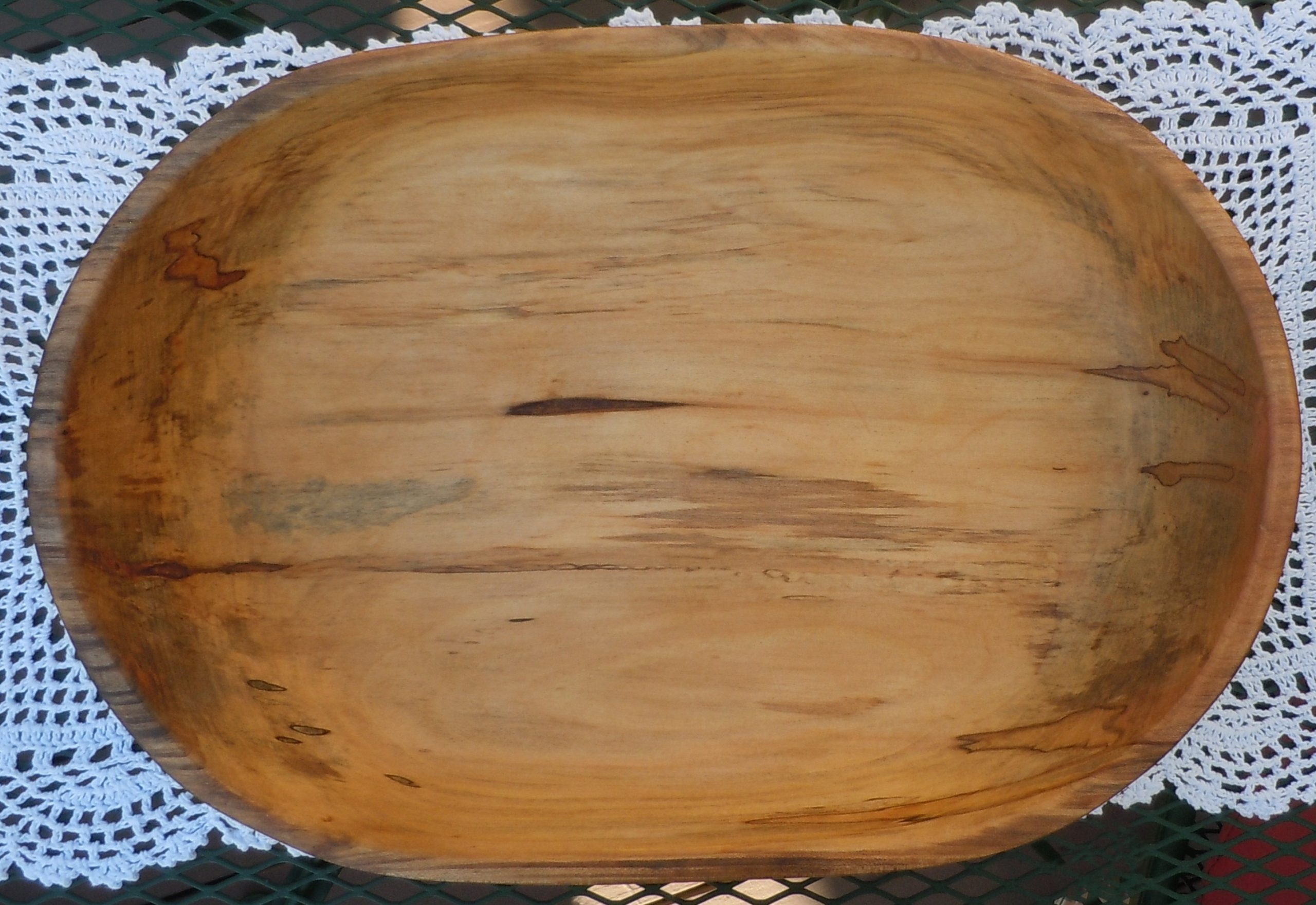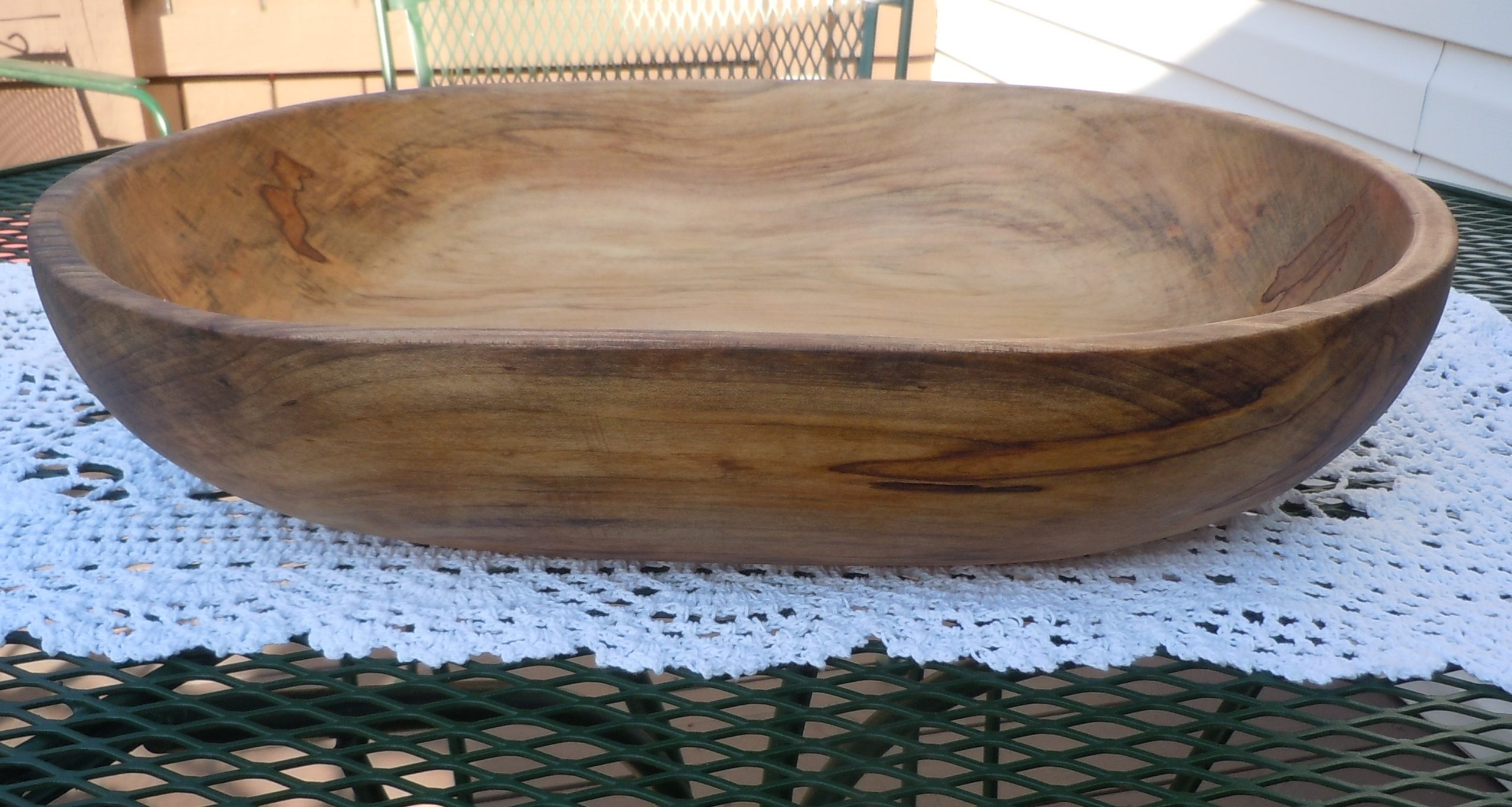 This is a nice large maple dough bowl that measures approximately 19″ L x 12 3/4″ W x 3 1/2″ H. It’s sanded smooth inside and out
