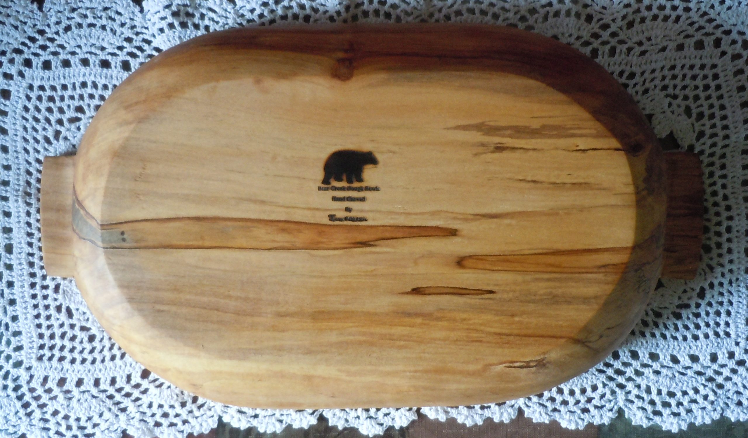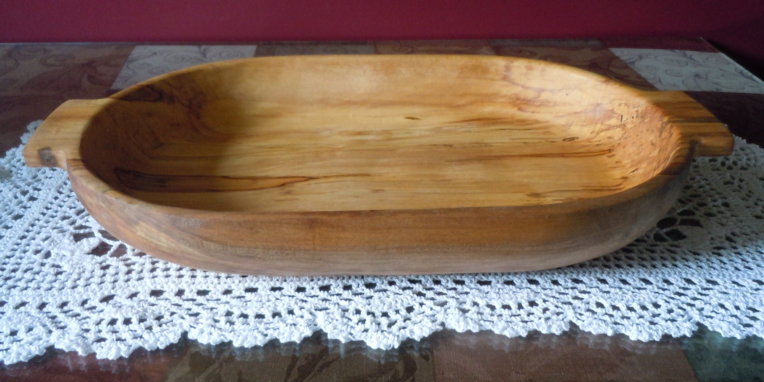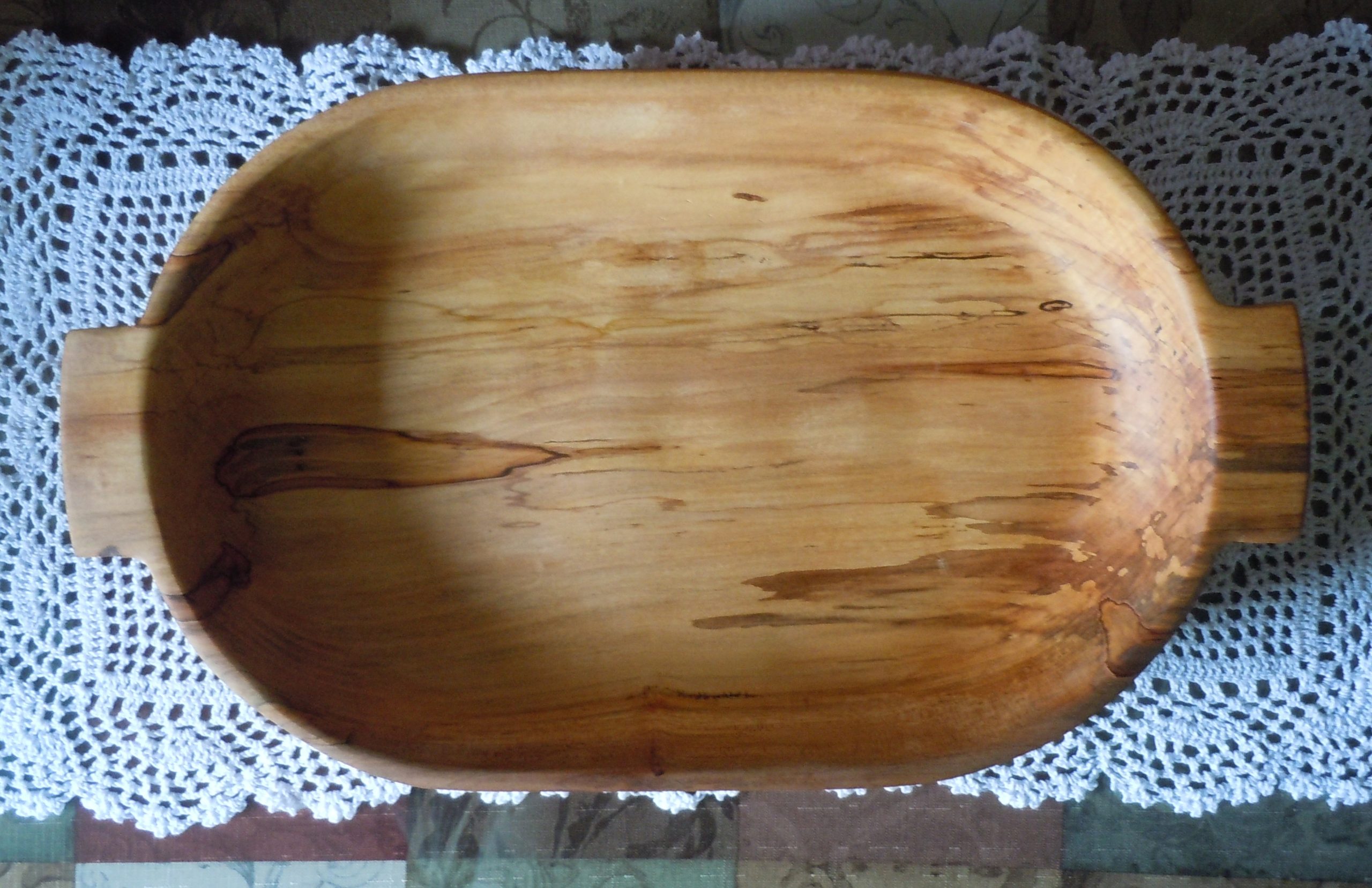 Here’s a large, honey colored spalted maple bowl that’s a little shallower. It’s nice and wide making it a great bowl for kneading bread or using as a large serving bowl. It measures approximately 20 1/2″ long including 1 1/4″ handles, 11 3/4″ W x 2 3/4″ H. Sanded smooth inside and out.