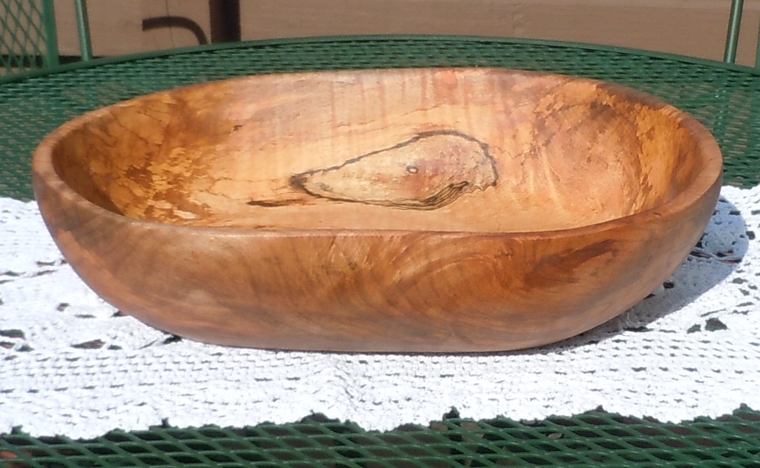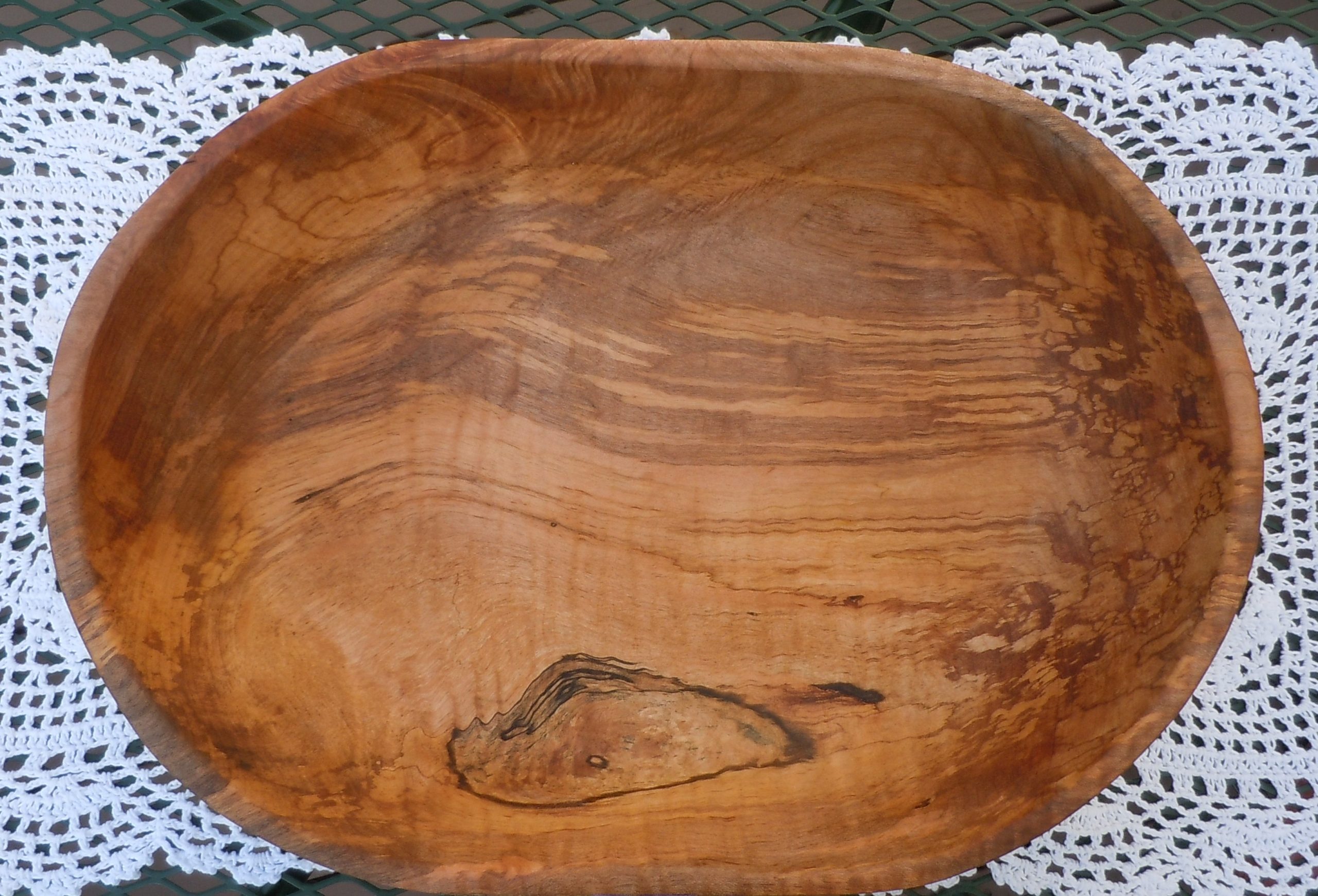 Here’s a multi-colored, tiger striped maple bowl that is loaded with color and character. It’s wide and deep to allow for plenty of working room. When not in use it’s a beautiful piece of art to display on counter top or table. It measures approximately 16 1/2″ L x 11 1/2″ W x 3 3/4″ H. It’s sanded smoot inside and out.