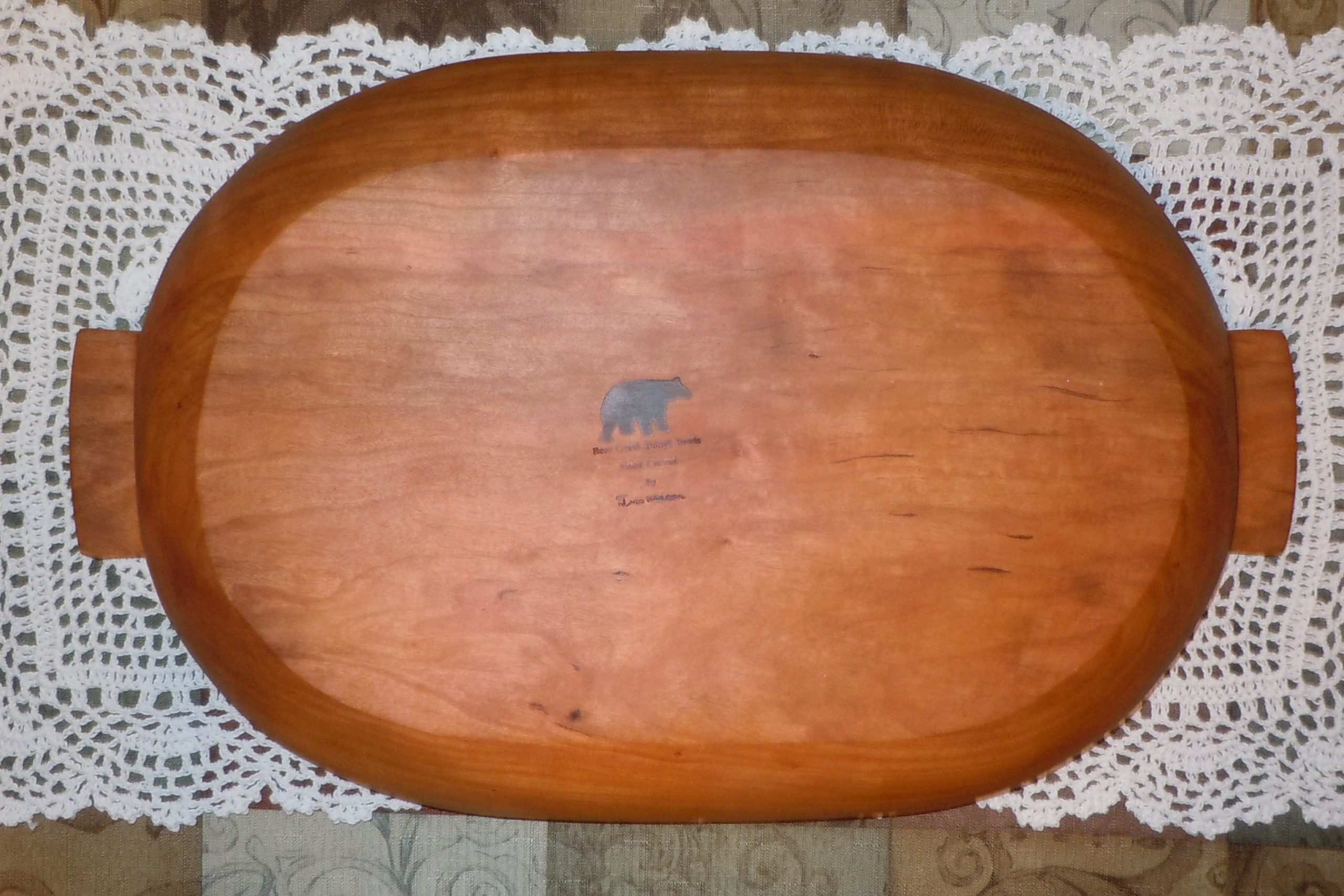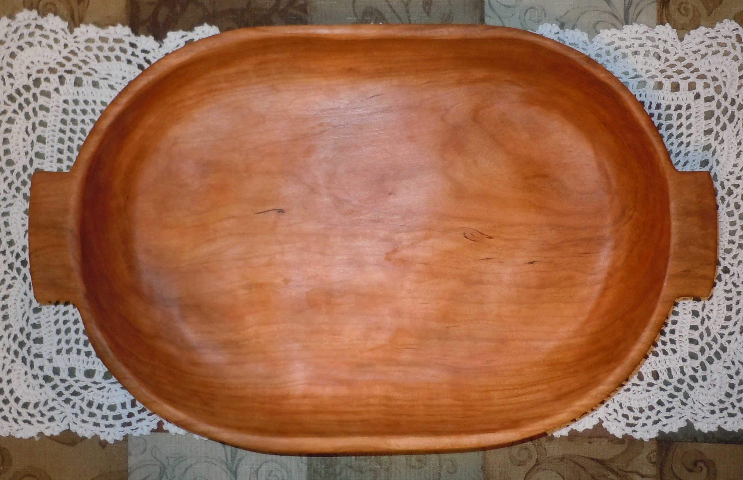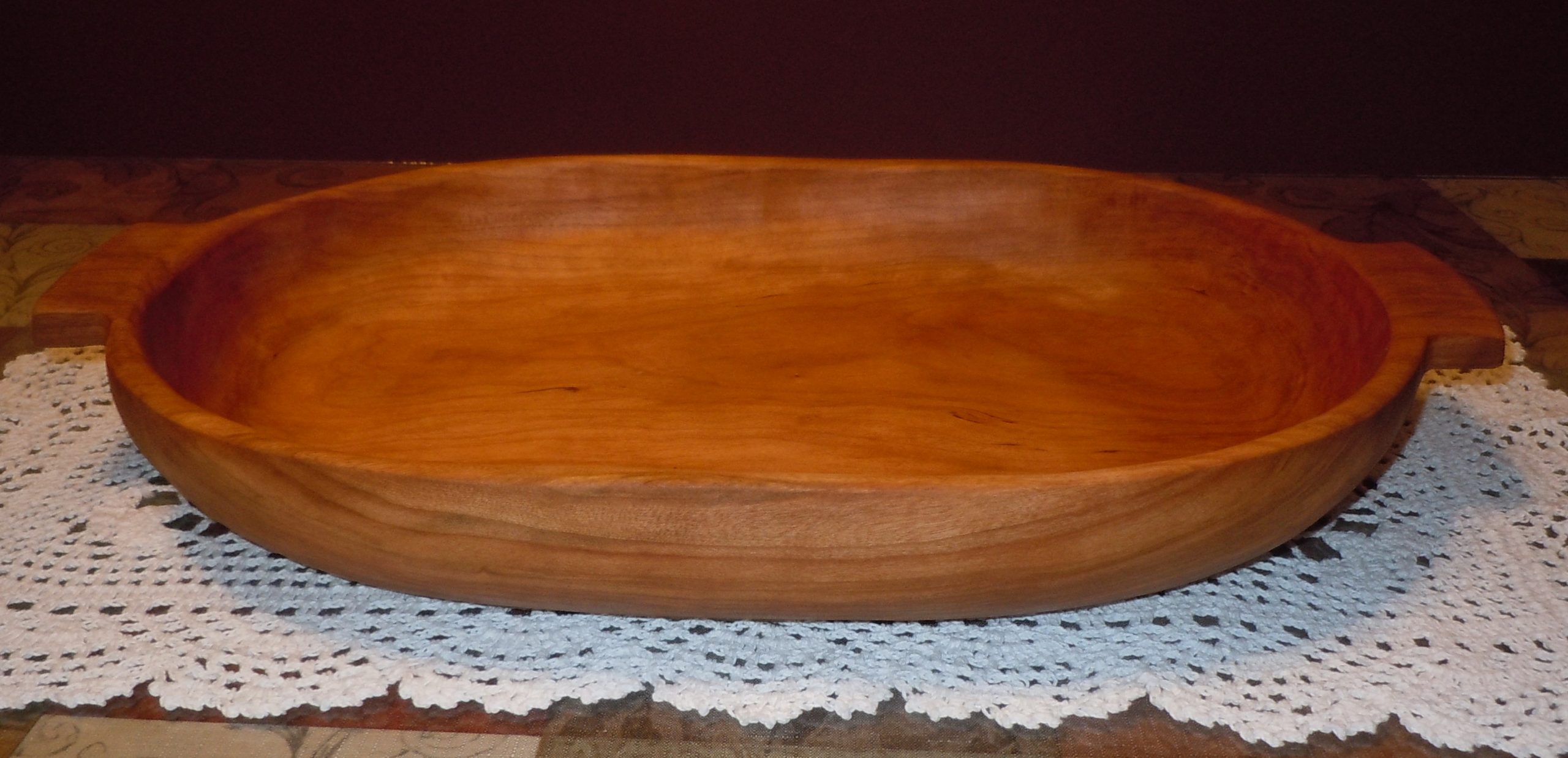 This cherry piece would make a perfect serving bowl for large family gatherings. The handles make it easy to carry. It measures approximately 21 1/4″ Long including 1 1/2″ handles, 13 1/4″ wide and 3″ high. It’s sanded smooth inside and out